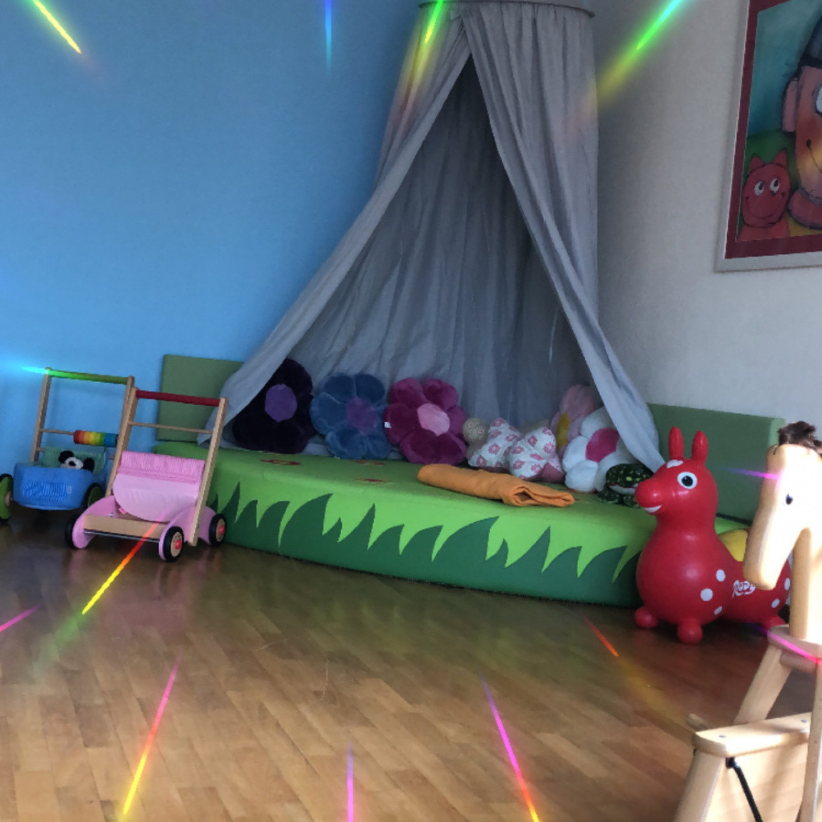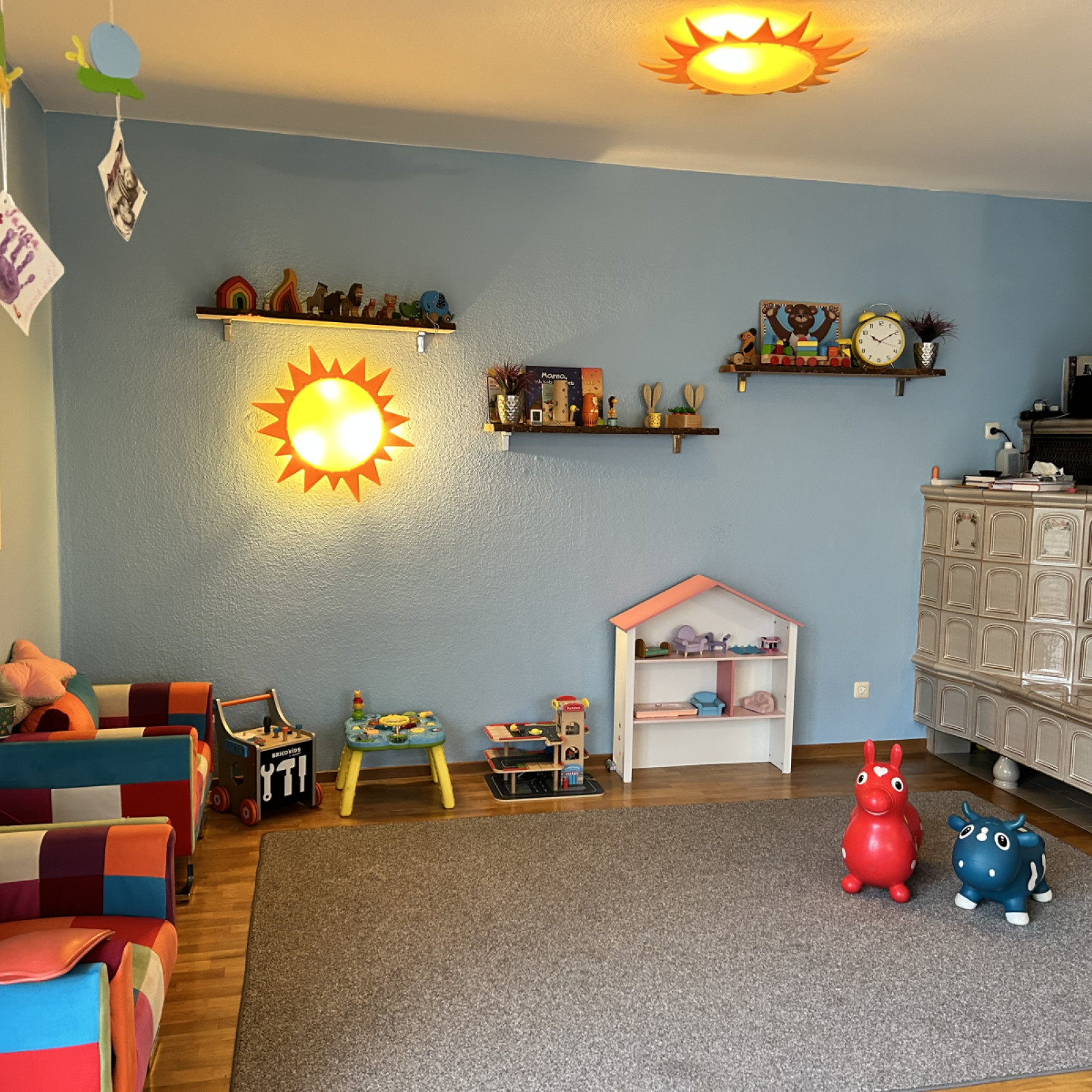 Die Räume unserer Kindertagespflege bieten den Kindern viel Platz zum Toben, Spielen und Schlafen. Es stehen 4 liebevoll eingerichtete Räume mit einer Fläche von insgesamt 95 Quadratmetern für vielfältige Entdeckungen bereit. Die Kindertagespflege findet in angemieteten Räumen statt. Die Einrichtung ist modern und mit der kindgerechten Ausstattung fühlen wir uns hier jeden Tag wohl. Sicherheit ist beim Spielen wichtig und so sind die Räume mit verschiedenen Features ausgestattet, die unbekümmertes Spielen ermöglichen.