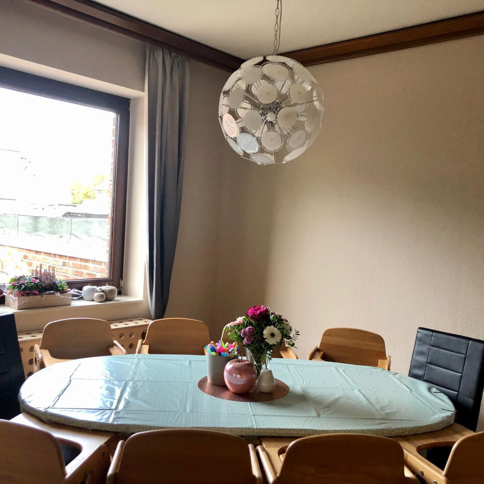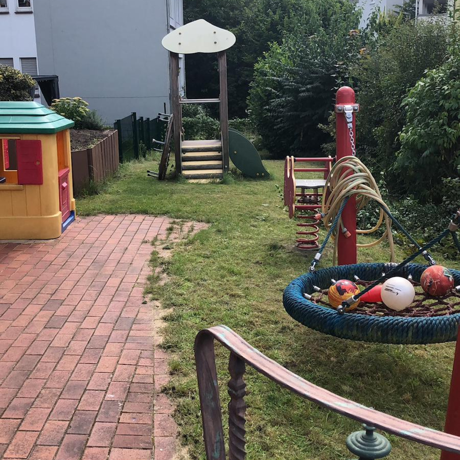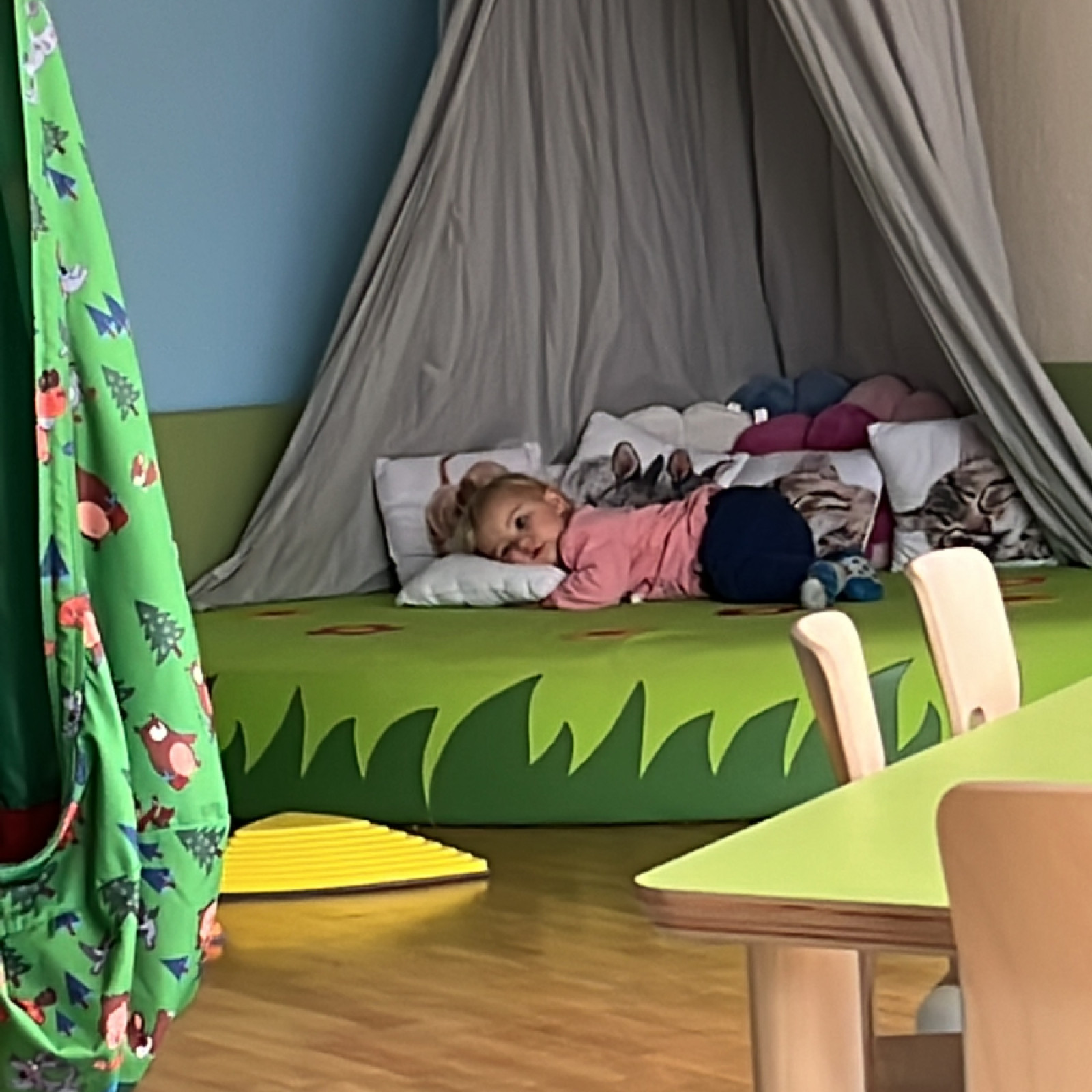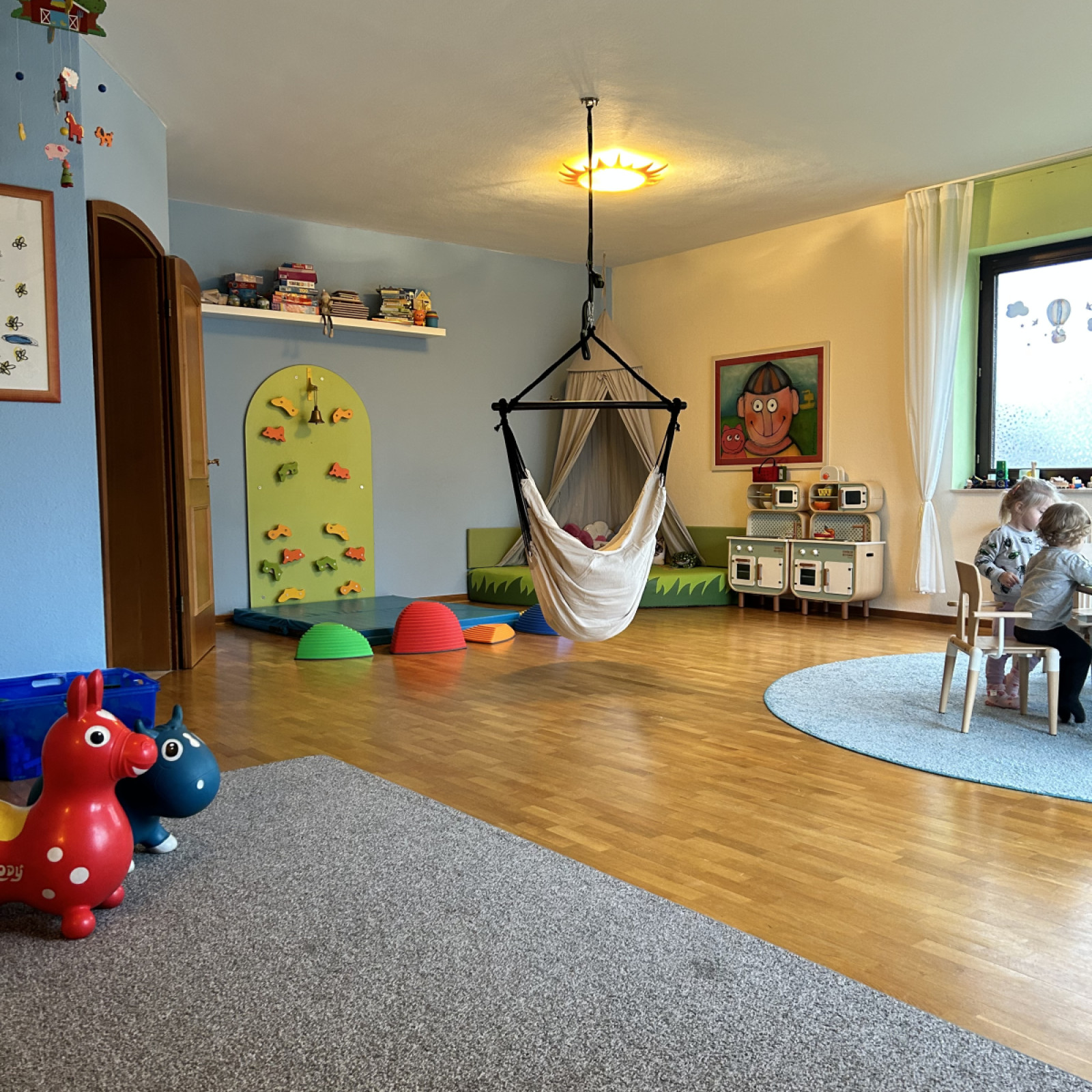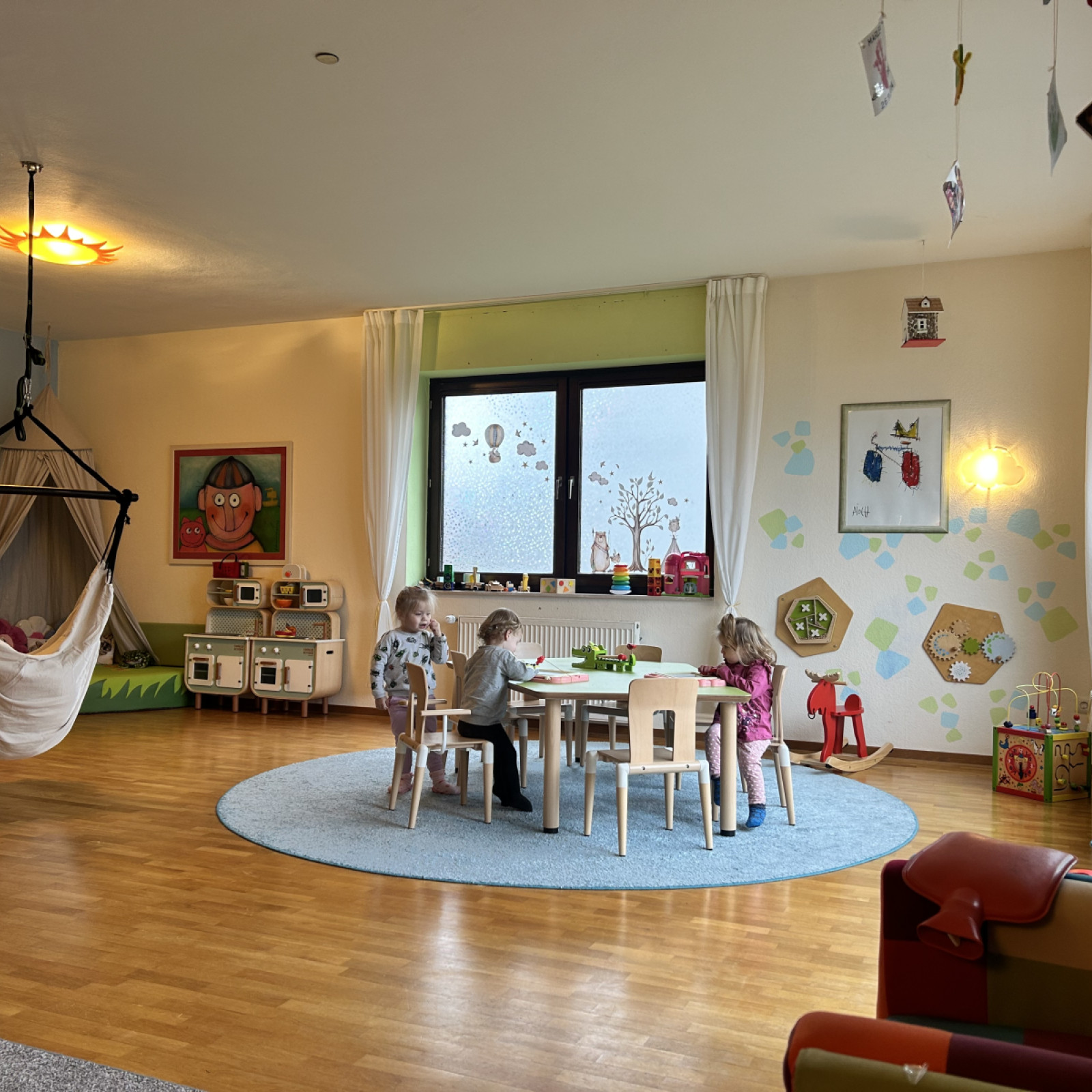 Kinder haben besondere Bedürfnisse an die Einrichtung: der Waschbereich hat einen Wickeltisch, niedrige Waschbecken und eine separate Toilette. Für den Mittagsschlaf oder um sich auszuruhen gibt es den Schlafbereich mit einer eigenen Matratze für jedes Kind. Die Küche ist besonders wichtig: hier bereiten wir – auch oft gemeinsam mit den Kindern – die Mahlzeiten zu und lassen es uns zusammen am großen Tisch schmecken. In den Räumen gibt es verschiedene Bereiche zum Basteln oder Spielen – mache Bereiche werden auch für verschiedene Anlässe umgeräumt. In den Räumen wird natürlich nicht geraucht.